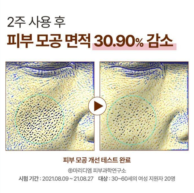 단, 1회 사용 후에도 가로모공이 개선되고, 2주 사용 후 모공 면적과 피부 거칠기가 개선되는
